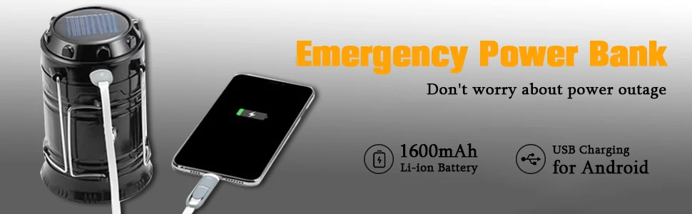 Dois métodos de carregamento: bateria recarregável de íon de lítio de 1600mAh integrada, a lanterna LED atualizada com dois métodos de carregamento: carregamento solar e carregamento USB.Proteção de desligamento automático, não se preocupe com sobrecarga.A lanterna com porta de saída USB pode ser usada como banco de energia para Android em caso de emergência.